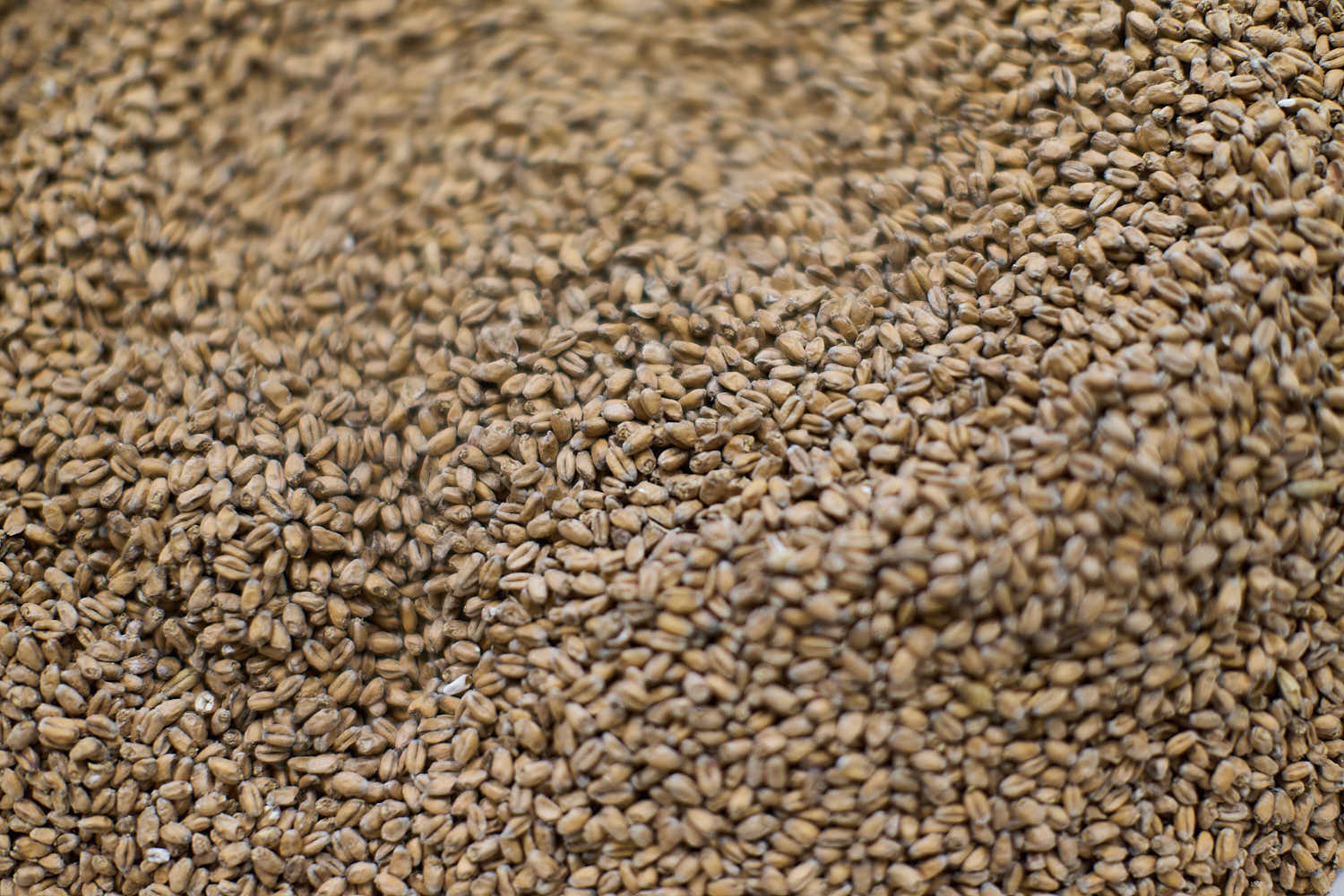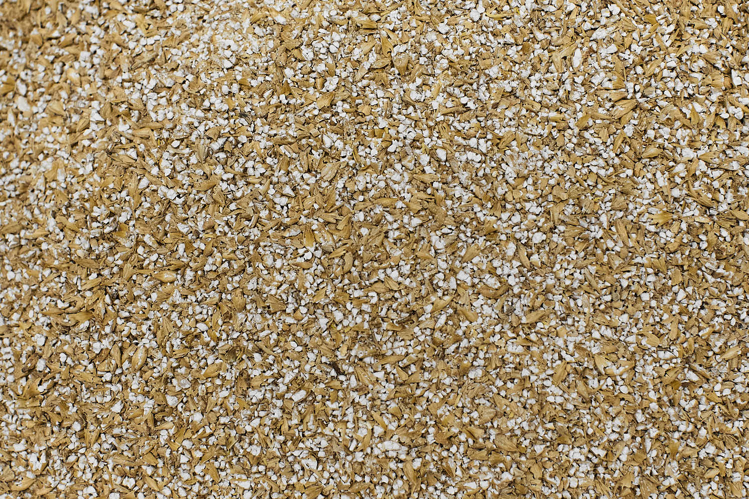 Krossningen av malt tillsammans med korn. Lägg märke till de något stora vetekärnorna, de kunde ha varit i mindre bitar.