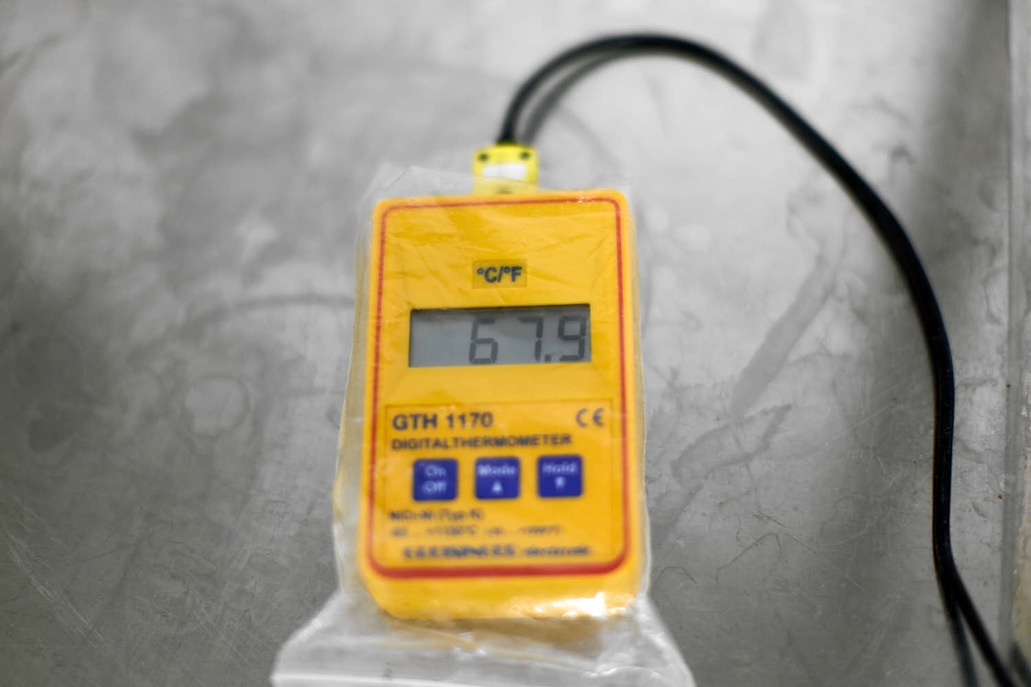 Inmäskningen gick bra och jag körde helt manuell omrörning denna gång, ingen skruvdragare och Brewtools-mäskpaddeln. Det syrefria mäskvattnet på 67,9°C gav efter omrörning 63,4°C i mäsken för betaamylasrasten. Efter 45 minuter fyllde jag på med resterande mmängd mäskvatten (cirka 1/3-del) och hamnade troligtvis runt 71°C som jag häll i 30 minuter. ”Troligtvis” eftersom jag inte kan mäta mäsktemperaturen så långt ner eller i mitten utan att lyfta på det flytande locket vilket jag inte vill göra.