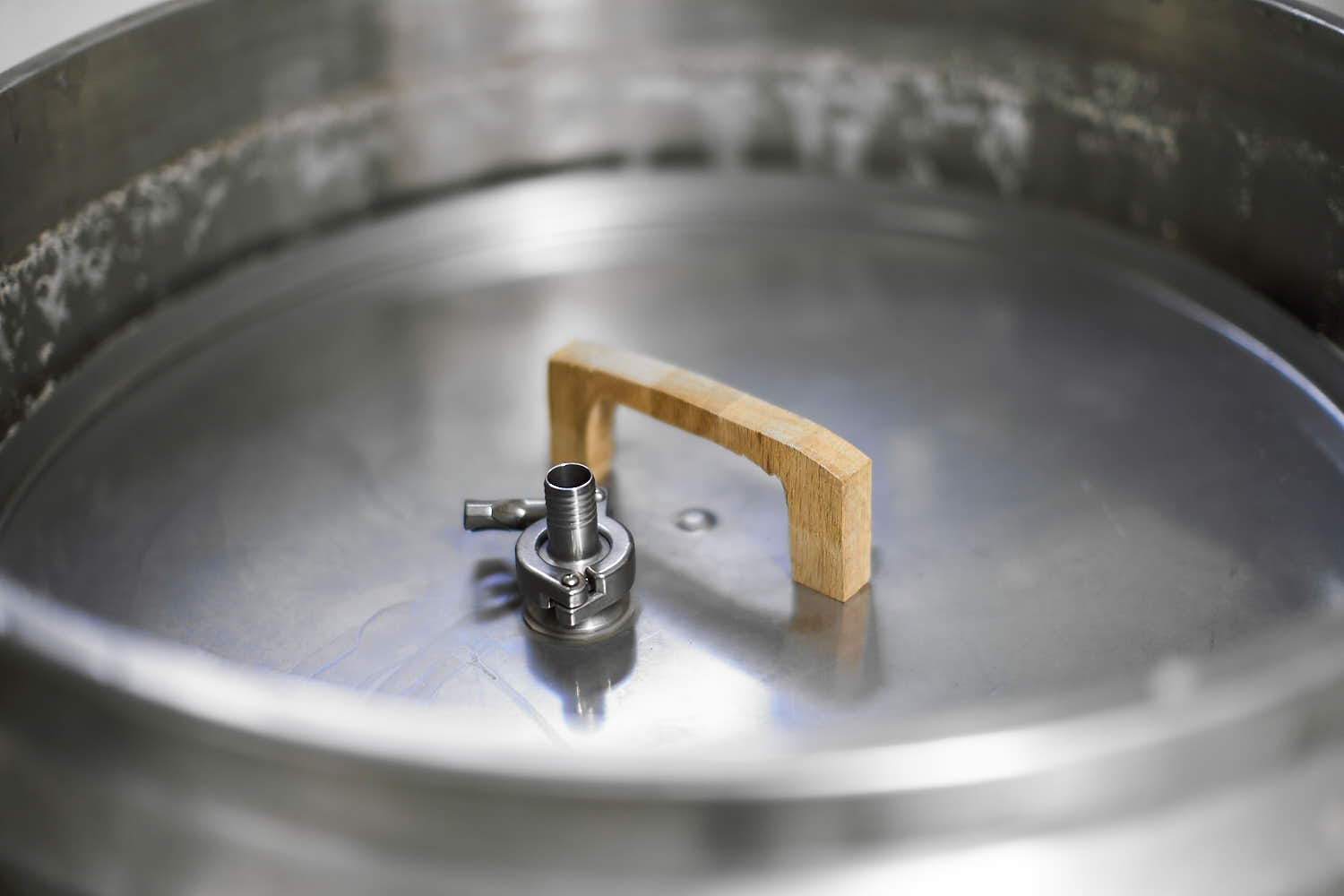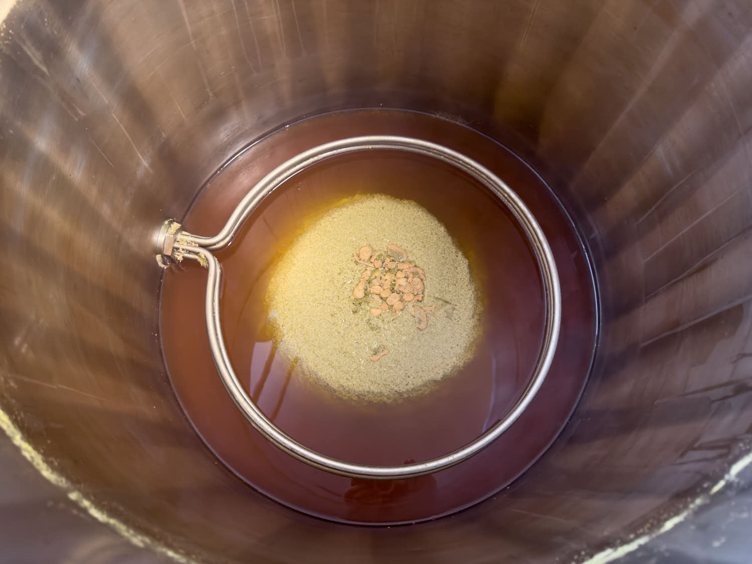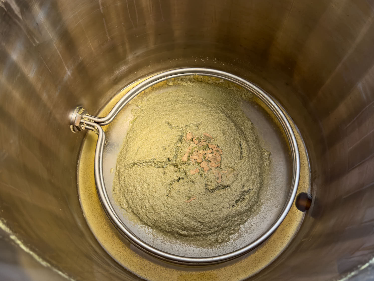 Här syns whirlpoolfiltret och hur merparten druv och humle stannat kvar i mitten.