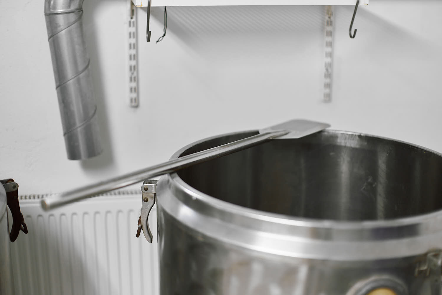 Första vörten från mäsken i vörtpannan. Så fort värmepatronen är täckt så åker max effekt 10.000 watt på.