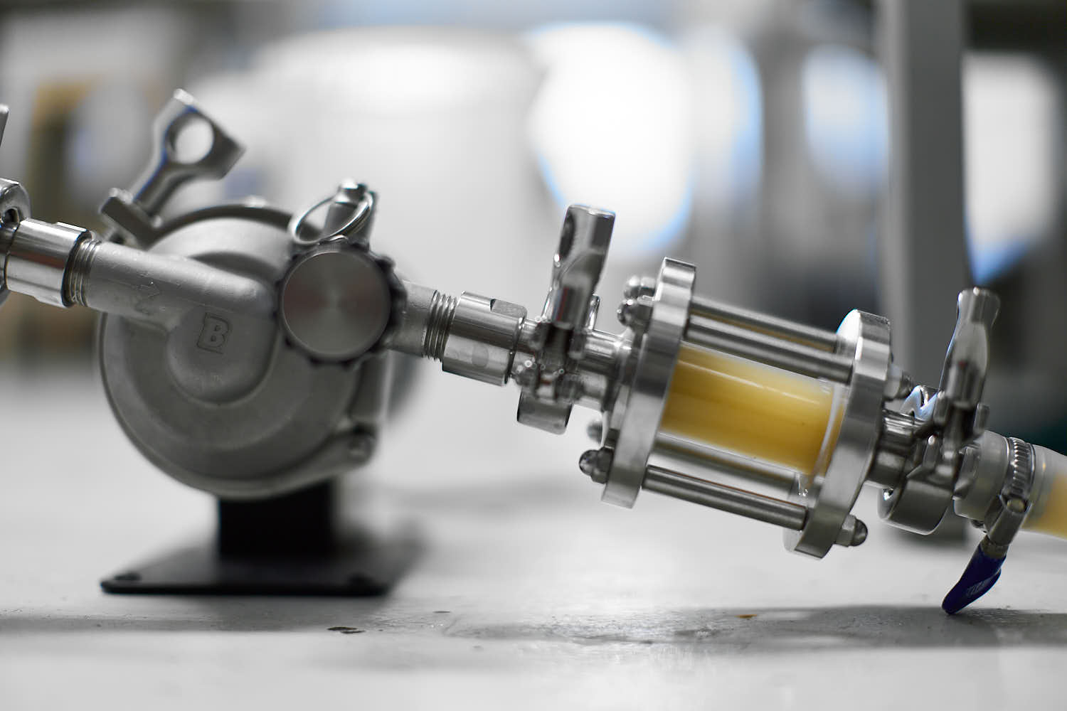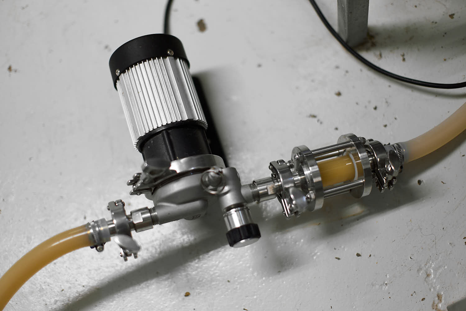 Mäskningen i full gång. Fint homogent flöde på recirkuleringen.