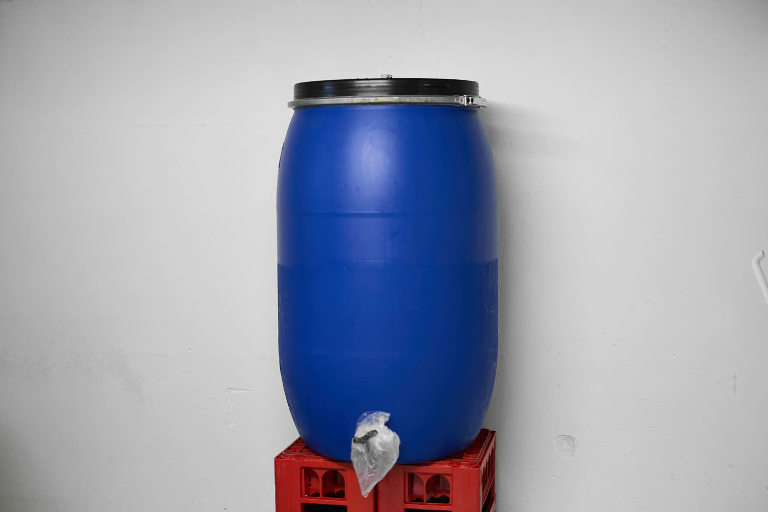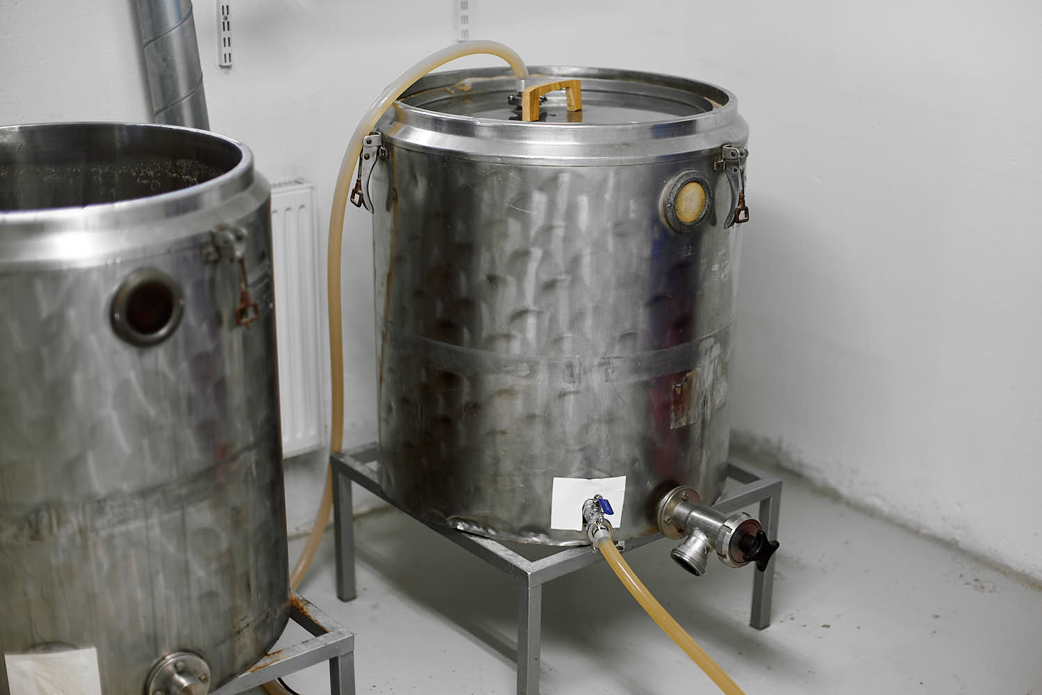 Min fula men lätthanterade jästunna. Jag skickar vörten in genom kranen i botten och även om jag sprayar med Saniclean så har jag sett någon bananfluga hänga där någon gång så sommartid har jag en sanicleanad plastpåse runt. Just större jästank på cirka 150-200l är det jag helst vill uppgradera framöver.
