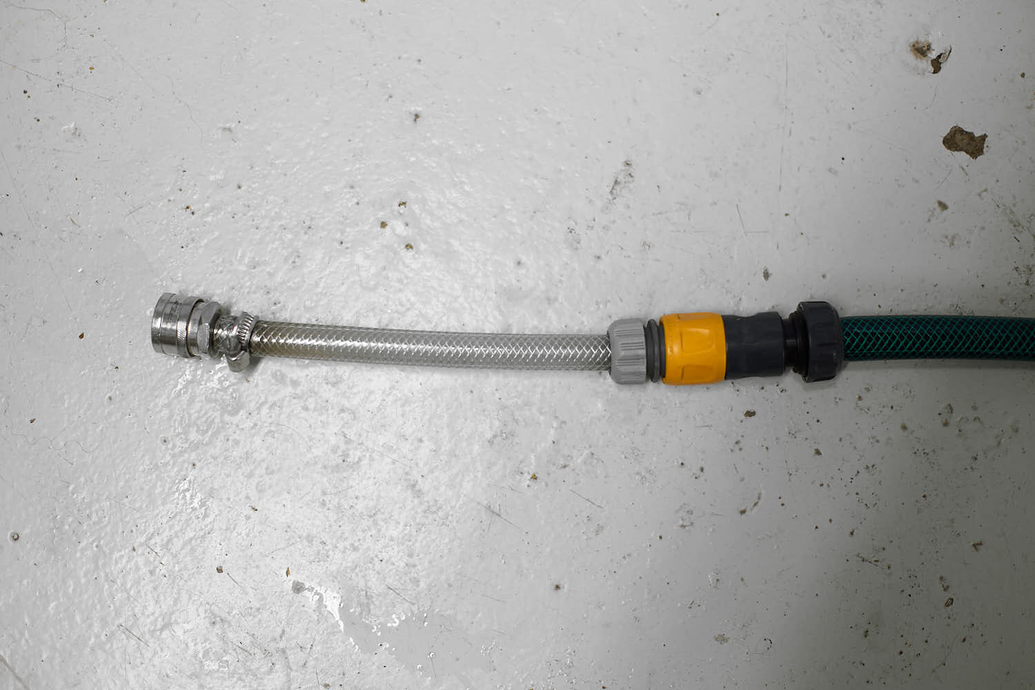 Någon bad mig ta en bild på mina kopplingar till plattvärmeväxlaren så här kommer de. Det är QD-kopplingar (quick disconnect) som jag inte är så förtjust i. De är förvisso smala och smidiga men ganska svåra att få på plats. På gardenasidan är en övergång från 1/2″ standardslang till den större 3/4″ som jag har för att få snabbare flöde på kylvattnet.