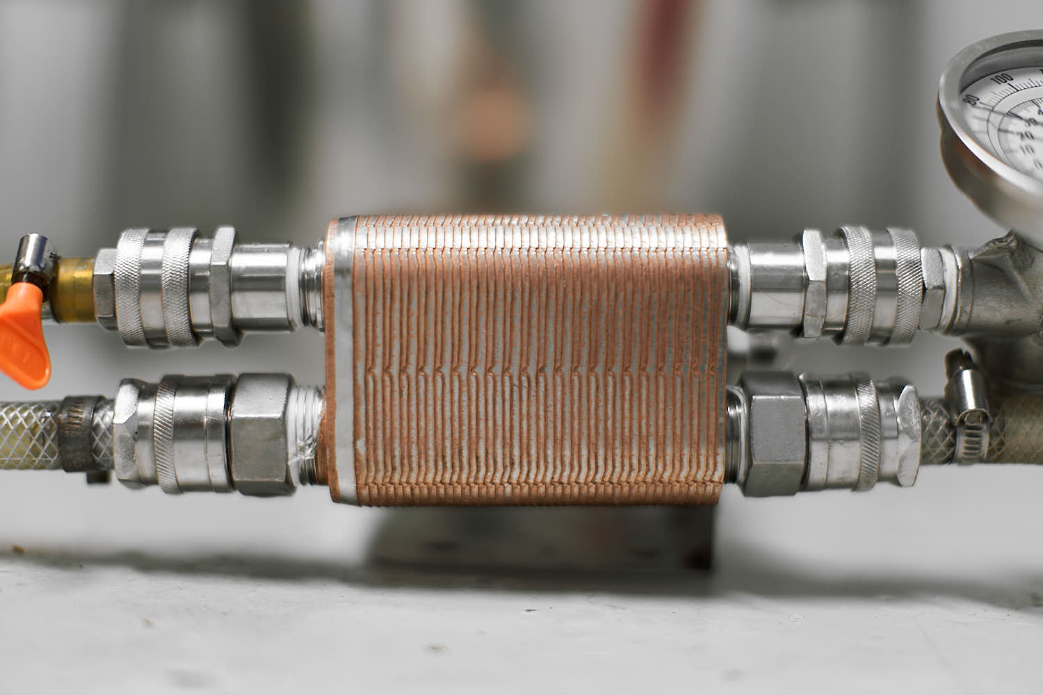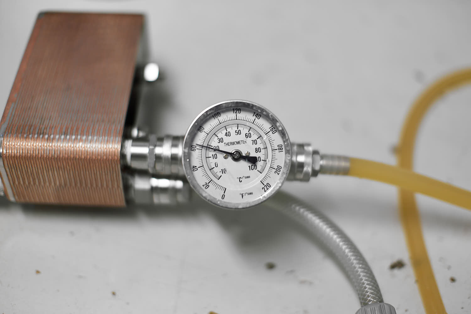 Här monterat på PVVn. Överst är QD-honor för vörten och unders är hanar för kylvattnet vilket gör att jag inte kan koppla fel och skicka vörten rätt ut i avloppet och kylvatten till jästunnan.