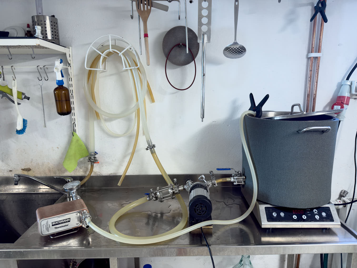 Vörtkoket fastnade inte på bild men det vet ni ju hur det ser ut. Här är kylningen i full gång med hjälp av inbyggda pumpen och min Brewtoolsmotströmskylare.